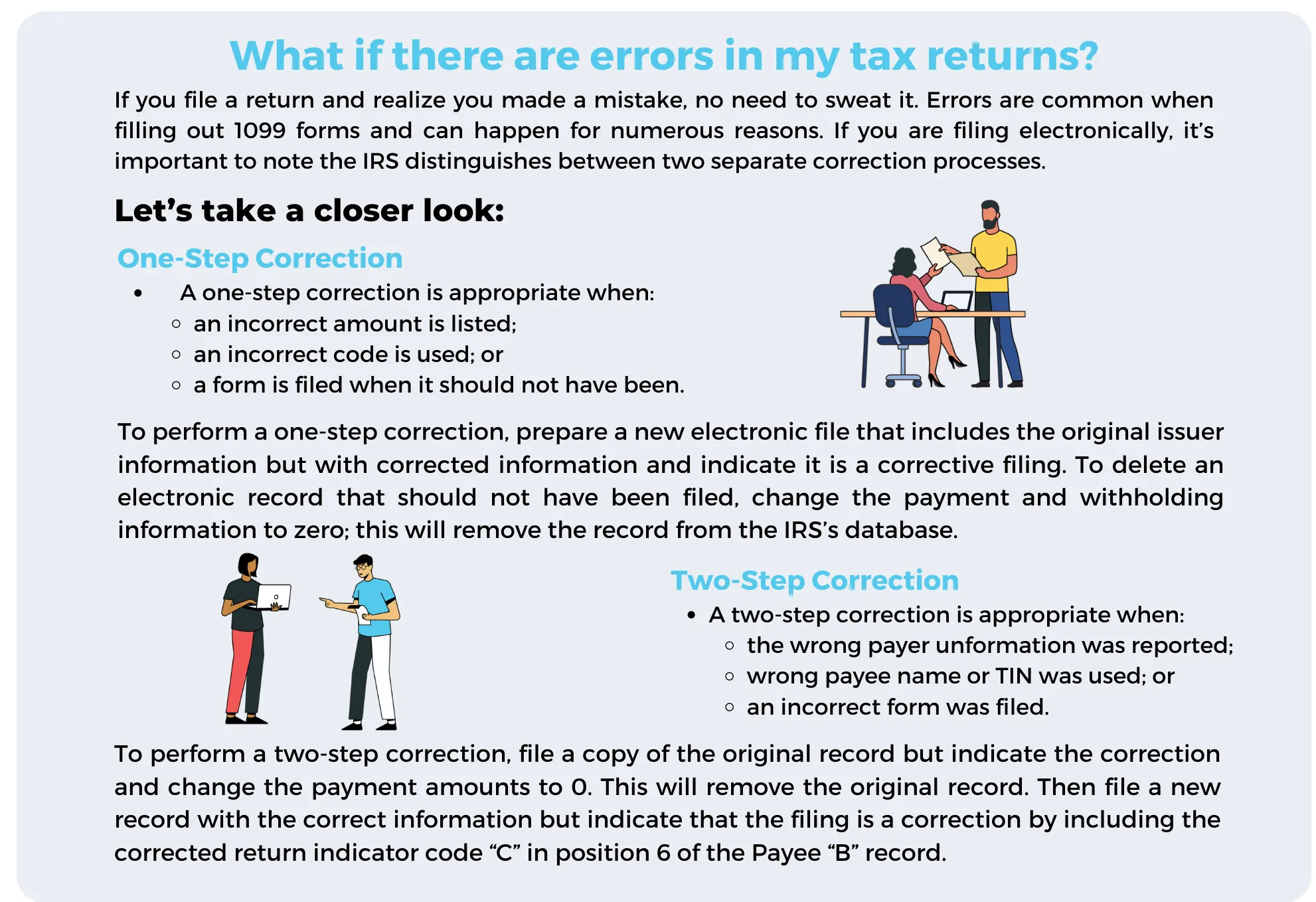 The IRS processes millions of information returns each year, many of which require filing a corrected return. For tax year 2023, the IRS has changed the way in which corrections must be filed. Failure to file your corrections in the proper method can result in potentially costly penalties and extra time-consuming rework. Here is our guide to filing corrections this tax season.